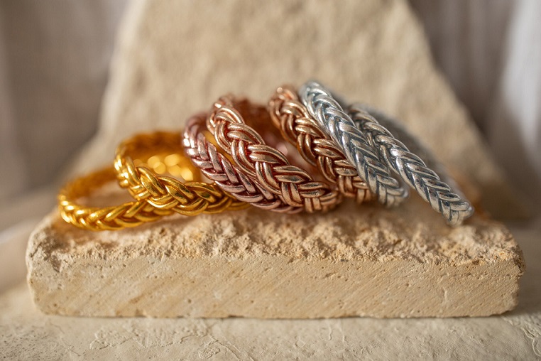 • Each bracelet and ring is embedded with a 22K gold-leaf core, wrapped in a sleek silver or gold-plated shell, and sealed with a silicone covering to make it waterproof, soundless, and lightweight.