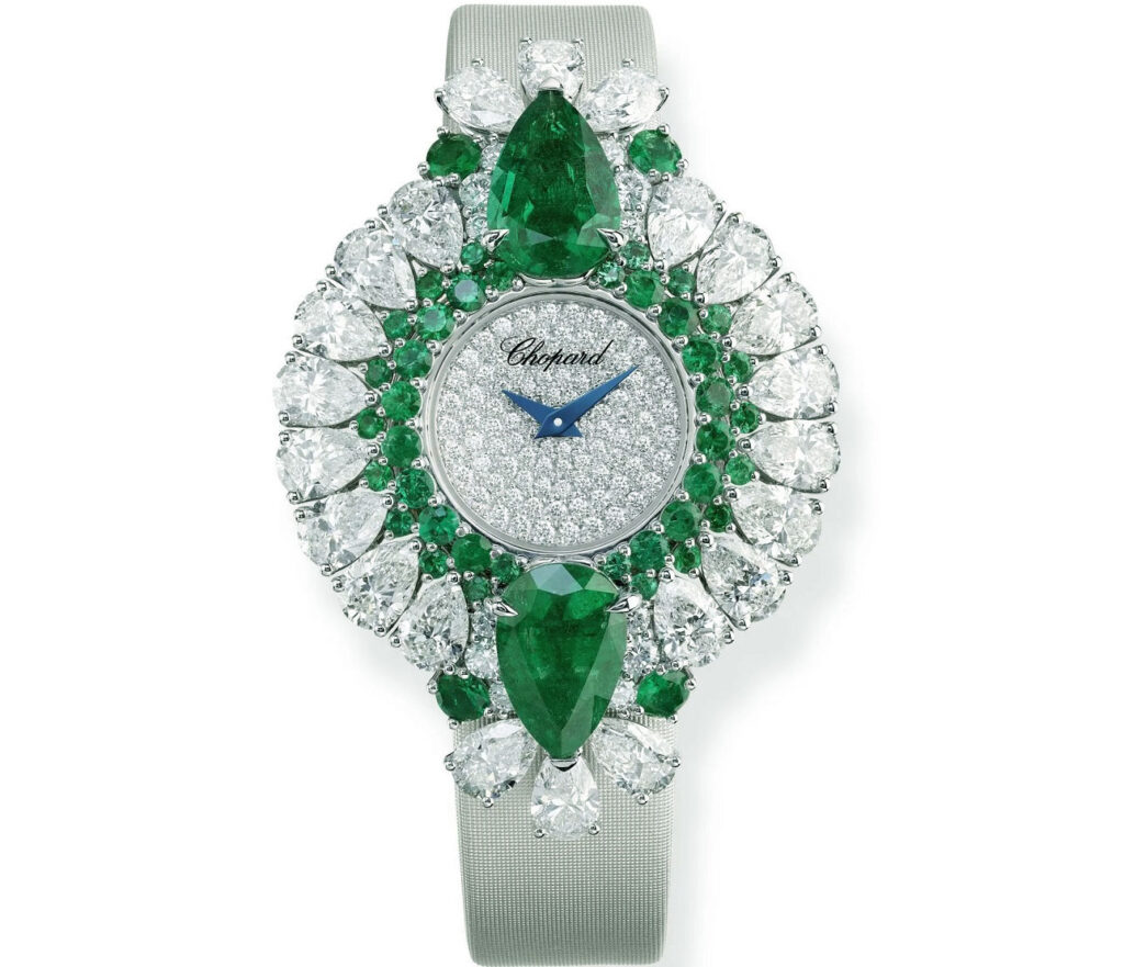 Other notable creations include a 15.53-carat octagonal emerald surrounded by pink sapphires, a diamond choker with a 2.50-carat square-cut emerald, and an intricate cuff blending emerald foliage with tsavorites and woven pearls. There’s even a jewellery watch, further proving that haute joaillerie can be both artistic and functional.