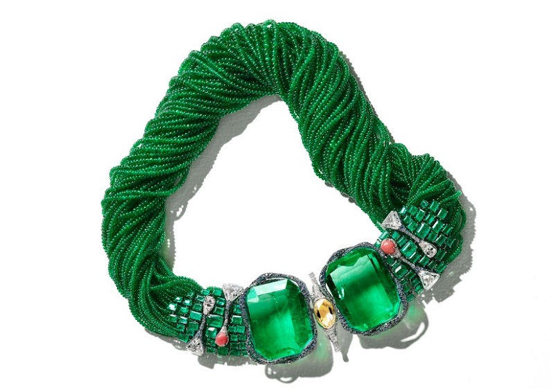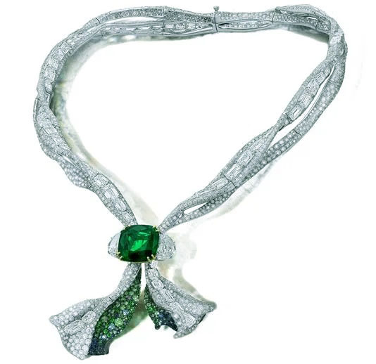 An emerald and diamond necklace resembling sea algae