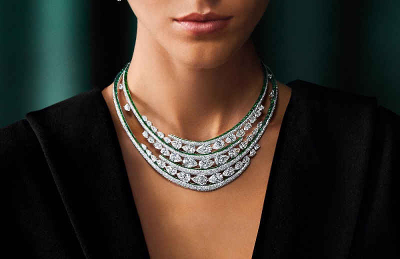- a 136-carat diamond-and-emerald suite featuring a bold chain motif that merges strength with grace, and a 90-carat diamond necklace adorned with precise baguette-cut emeralds that reflect light like silk.