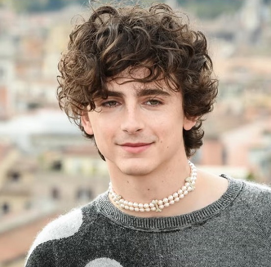 American-French actor Timothee Chalamet wearing a pearl necklace for men that was made in Bangkok
