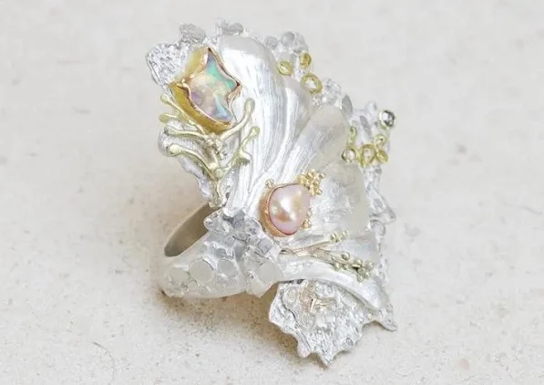 While heritage brands safeguard the classic codes of pearl jewelry, emerging designers are pushing the gem into more experimental territory. Laura Ngyou’s Tridacna-Shen Ring exemplifies this creative momentum. Combining silver with 14ct, 18ct and 9ct gold alongside pearl, diamond and opal, the piece explores texture and form through melting and hammering techniques.