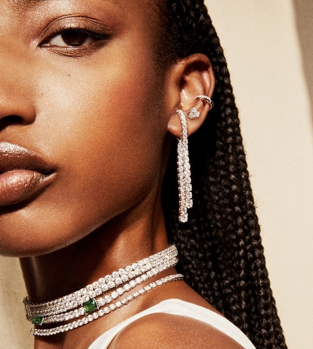 The Matrix collection remains a core favorite, embodying the spiral perfection of crystal formations. This year, it brings a sharp holiday edge with Matrix Baguette designs, featuring ribbon motifs fashioned from gradient zirconia crystals. Hoop earrings, tennis bracelets and chokers shine with marquise-cut accents, while Matrix Crash returns in two-tone metals, showcasing playful rings and bracelets. Each piece is designed to radiate party-ready sophistication while retaining an air of classic elegance.